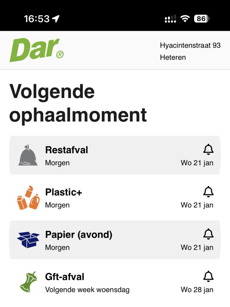 Let goed op waneer welke soorten afval buiten gezet moeten worden! Er zijn wijzigingen door de DAR doorgevoerd dus kijk op de afvalkalender of zet de app van de DAR op je mobiel schakel meldingingen in dan krijg je ook een berichtje dat je bv papier of wat er dan ook aan de beurt is buiten moet zetten. Want het probleem is als je het op verkeerde moment buiten zet ruimt niemand het op voor U dus gebeurd verwijder het dan ook zelf weer.